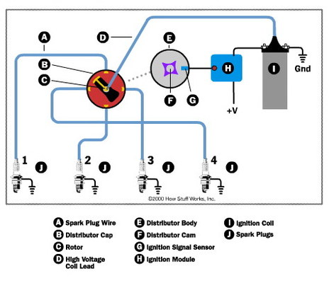 แบตเตอรี่ของรถยนต์ ให้กระแสไฟฟ้าที่ความต่างศักย์ต่ำสำหรับระบบจุดระเบิด ดังนั้นจึงต้องให้กระแสไหลเข้าสู่ขดลวดหรือคอยส์ (coil) ซึ่งทำหน้าที่เหมือนหม้อแปลง โดยจะเพิ่มความต่างศักย์ขึ้นเป็นหลายพันโวลต์ จากนั้นจานจ่าย (Distributor) จะส่งกระแสที่มีความต่างศักย์สูงไปยังกระบอกสูบแต่ละอัน กระแสนี้ทำให้เกิดประกายไฟขึ้นที่หัวเทียน (Spark Plug) ซึ่งจะจุดระเบิดน้ำมันในกระบอกสูบ