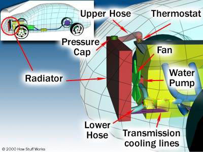 ประกอบด้วย หม้อน้ำ (Radiator) และปั๊มน้ำ น้ำจะถูกปั๊มอัดให้ไหลผ่านไปตามส่วนต่างๆของเครื่องยนต์ และไหลกลับมาระบายความร้อนที่หม้อน้ำ การระบายความร้อนใช้กับเครื่องยนต์ขนาดใหญ่ ส่วนเครื่องยนต์ขนาดเล็กใช้อากาศช่วยระบายความร้อน เช่นมอเตอร์ไซด์ และเครื่องตัดหญ้า การระบายความร้อนด้วยอากาศมีข้อดีอยู่เหมือนกัน คือ เครื่องยนต์มีขนาดเบา แต่ข้อเสียคือ ความร้อนค่อนข้างสูง ทำให้อายุการใช้งานของเครื่องยนต์สั้น และประสิทธิภาพต่ำ